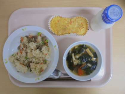 ☆2月6日(月)の給食の写真です。(豚肉とごぼうのごはん 牛乳 けんちん汁 切干大根の卵焼き)