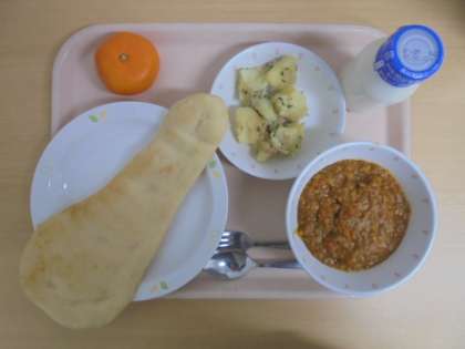 ☆2月7日(火)の給食の写真です。(ナン 牛乳 キーマカレー ジャーマンポテト みかん)