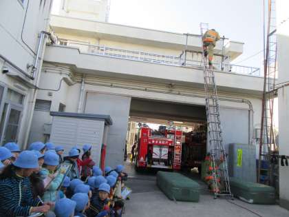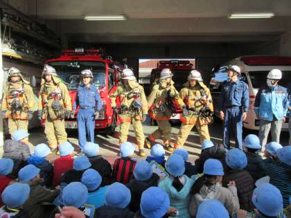 子どもたちが見学途中に出動要請がかかり、実際に消防隊の方々が消防車に乗って現場へ出動するところも見学しました。(幸い火災はなかったようです。)