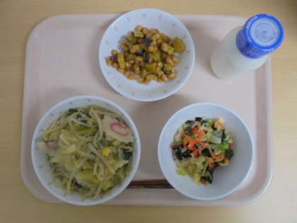 ☆2月10日(金)の給食の写真です。(みそラーメン 牛乳 わかめサラダ お豆かりんとう)