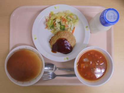 ☆2月15日(水)の給食の写真です。(ミルクパン 牛乳 ハンバーグ フレンチサラダ ミネストローネ)