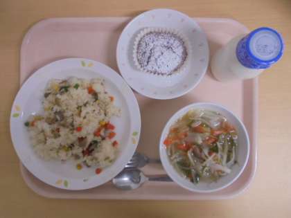 ☆2月17日(金)の給食の写真です。(鶏ごぼうピラフ 牛乳 フォー・ガー ココアケーキ)