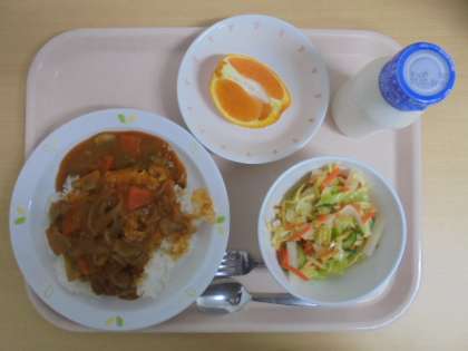 ☆2月22日(水)の給食の写真です。(ハヤシライス 牛乳 じゃがいものハニーサラダ デコポン)