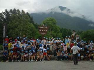 空に向かって青帽を投げる子どもたちのバックには、男体山がそびえ立っています。