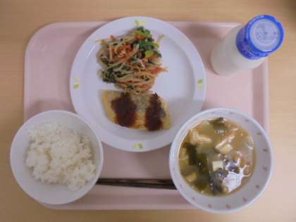 ☆3月8日(水)の給食の写真です。(ごはん 牛乳 魚のステーキソース 野菜のおかか和え じゃがいもと油揚げのみそ汁)