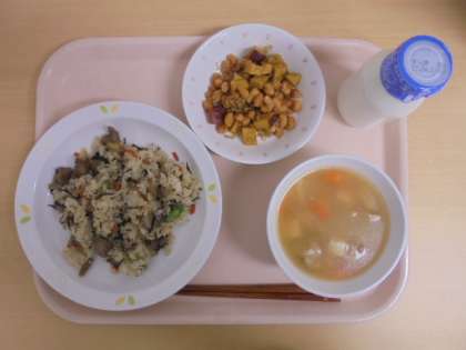 ☆4月11日(火)の給食の写真です。(五目ごはん 牛乳 豚汁 大豆とさつま芋の甘辛揚げ)