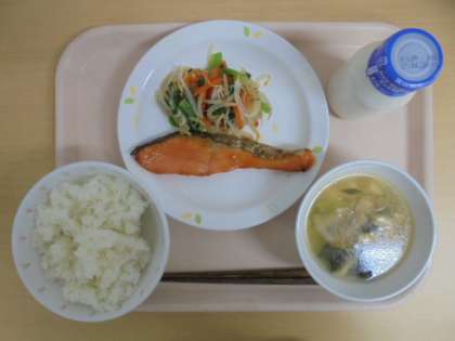 ☆4月13日(木)の給食の写真です。(ごはん 牛乳 鮭の照り焼き おひたし 吉野汁)
