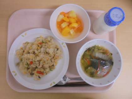 ☆4月14日(金)の給食の写真です。(チャーハン 牛乳 中華スープ フルーツポンチ)