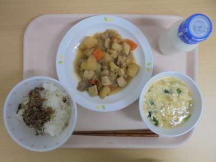 ☆4月20日(木)の給食の写真です。(ごはん 牛乳 かみかみ佃煮 肉じゃが かき玉汁)かみかみ佃煮をかけたごはんをよく食べていました。佃煮やふりかけは白いご飯をたくさん食べてもらうためのとっておきのメニューです。