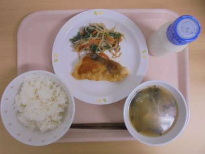 ☆4月27日(木)の給食の写真です。(ごはん 牛乳 魚のバーベキューソース 野菜のごまだれかけ 厚揚げとわかめのみそ汁)