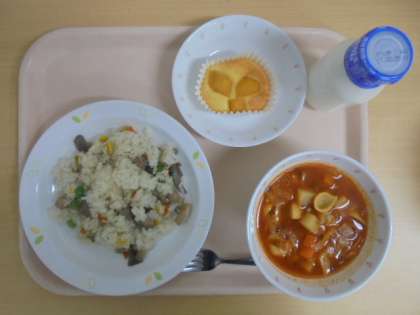 ☆4月28日(金)の給食の写真です。(とりごぼうピラフ 牛乳 ミネストローネ 桃のケーキ)