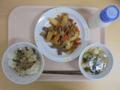 ☆5月1日(月)の給食の写真です。(ごはん 手作りふりかけ 牛乳 きんぴら煮 すまし汁)