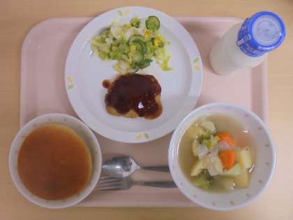 ☆5月9日(火)の給食の写真です。(ミルクパン 牛乳 ハンバーグ フレンチサラダ ポトフ)
