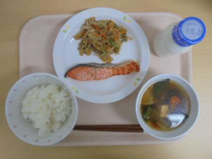 ☆5月10日(水)の給食の写真です。(ごはん 牛乳 鮭の塩焼き 切り干し大根の煮物 オリジナルけんちん汁)