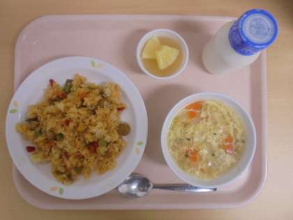 ☆5月11日(木)の給食の写真です。(ジャンバラヤ 牛乳 卵スープ パインゼリー)