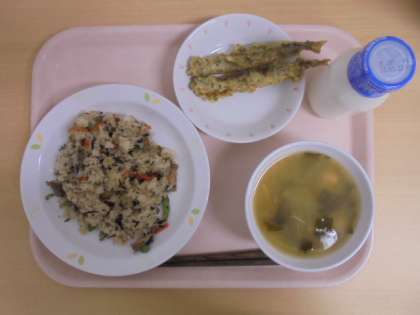 ☆5月16日(火)の給食の写真です。(ひじきごはん 牛乳 さつまいものみそ汁 ししゃもの磯辺揚げ)