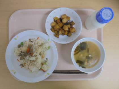 ☆5月22日(月)の給食の写真です。(豚肉とごぼうのごはん 牛乳 大根のみそ汁 いかとさつまいもの揚げ煮)