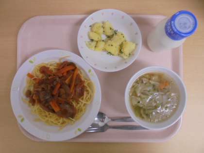 ☆5月25日(木)の給食の写真です。(スパゲッティナポリタン 牛乳 コンソメスープ 粉ふきいも)