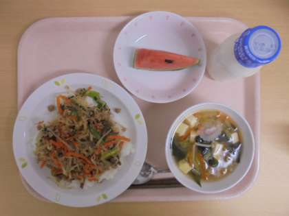 ☆6月1日(木)の給食の写真です。(ビビンパ 牛乳 中華スープ すいか)