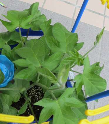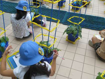 子どもたちが成長を楽しみに毎日水やりをしているあさがおがつるをのばし始めました。