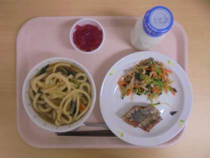 ☆6月9日(金)の給食の写真です。(カレーうどん 牛乳 さわらの竜田揚げ 野菜の梅おかか和え あじさいゼリー)