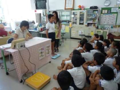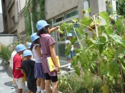 理科の観察で、ひまわりと背くらべ(写真2枚目)