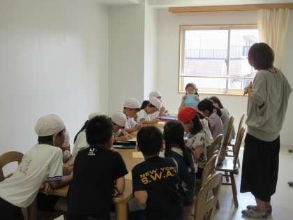 早速たくさんの子どもたちが集まってくれました。ALTの先生に自分の名前のローマ字での書き方を教わって、楽しそうに書いていました。