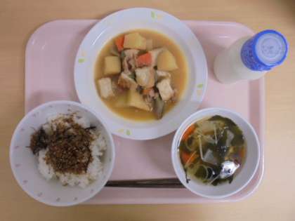 ☆6月21日(水)の給食の写真です。(ごはん 牛乳 かみかみ佃煮 五目うま煮 すまし汁)