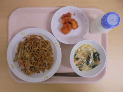 ☆6月23日(金)の給食の写真です。(ソース焼きそば 牛乳 卵スープ いかのチリソース)