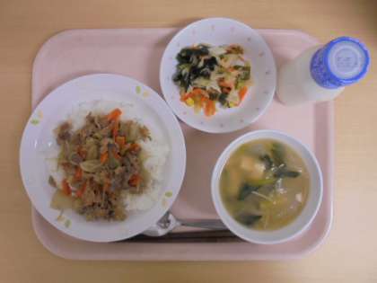 ☆6月26日(月)の給食の写真です。(豚丼 牛乳 さつまいものみそ汁 わかめサラダ)