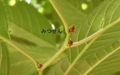 桜の葉の根元あたりに蜜腺と呼ばれるイボのようなものがついていて、そこから甘い蜜が出ているので、アリはこれを目当てに桜の木に登っているというわけです。桜は、甘い蜜を出してアリに来てもらい、アリは毛虫を追い払う役割をするかわりに甘い蜜をもらいます。桜にとって葉っぱを食べる毛虫は苦手なので、双方にとって良い関係となっているのです。