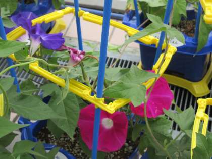 紫・水色・青・赤紫など色とりどりです。こどもの手のひらくらいの花が咲き、学校の玄関を明るくしてくれています。