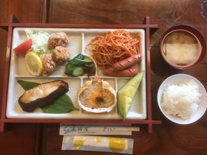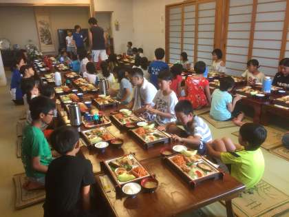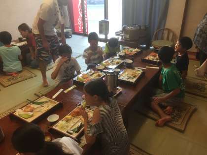 17時30分から夕食です。コシヒカリ100パーセントのおいしいご飯やメロンなどみんな腹ペコだったのであっという間に完食しました。この後は、浜辺の散策です。