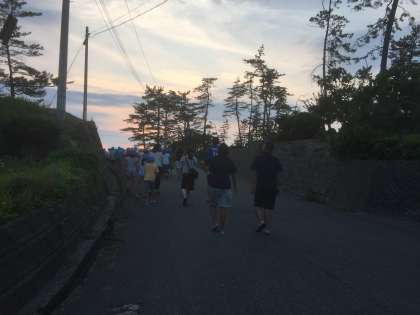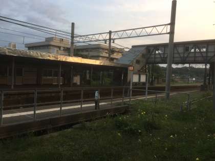 散策前に避難訓練をしました。地震後に津波警報が発令されたことを想定して宿舎裏の町指定の高台の場所を全員で確認しに行きました。その途中には、信越線の鯨波駅がありました