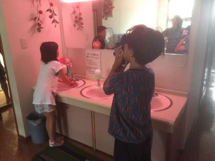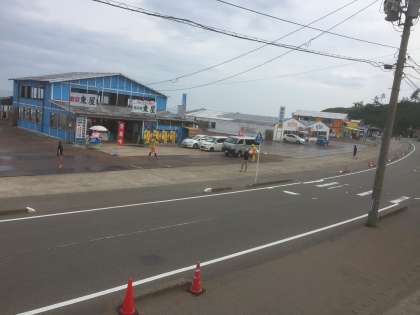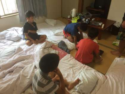 サマースクール2日目の朝です。天候は曇りです。予報では気温30度くらいまで上がるそうです。今日のコンディションも良さそうです。これから朝の班長会議が始まるところです。写真は、起床時の様子です。高岡屋さんの前には海の家が並んでいて朝から駐車場の呼び込みが盛んです。これから朝食です。