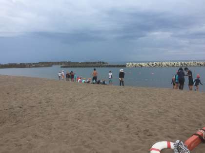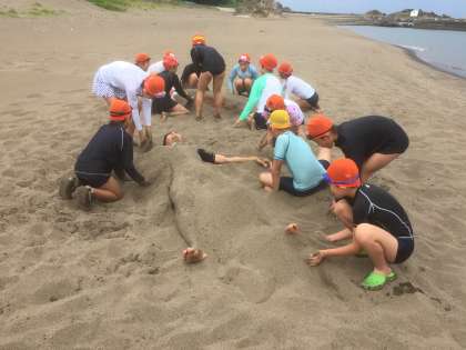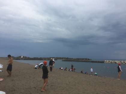 一回目の休憩です。天気が怪しくなってきました。風も出てきたので、午前中の海は早めの切り上げもするかもしれません。みんな先生を埋めはじめました。何人の児童や先生が埋められたことでしょう。