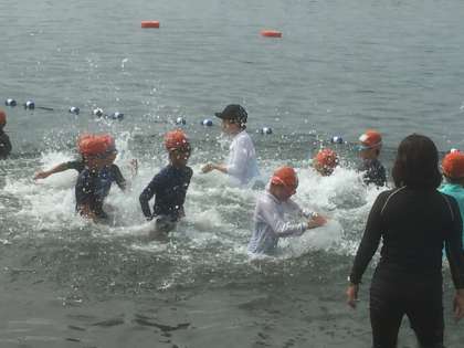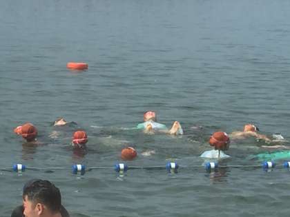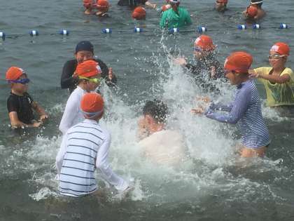 検定後に海泳ぎをしました。目標を達成したあとの海泳ぎは、たいへん盛り上がりました。