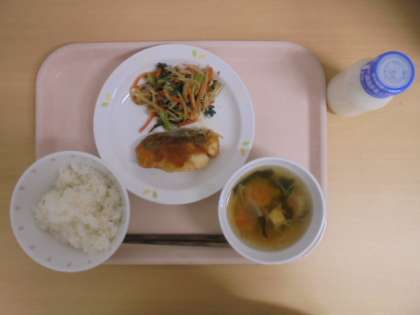 ☆9月5日(火)の給食の写真です。(ごはん 牛乳 魚のバーベキューソース 野菜のおかかかけ すまし汁)