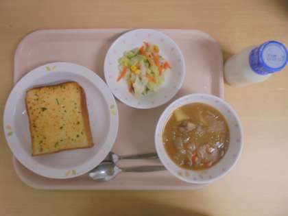 ☆9月6日(水)の給食の写真です。(ガーリックトースト 牛乳 ポークシチュー フレンチサラダ)