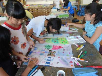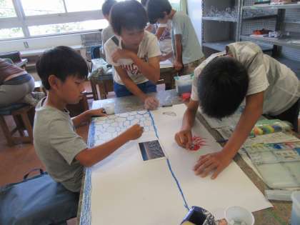 1枚の写真を選び、グループで写真の外側に広がる世界を想像して絵の具やペンなどを使って描いていきます。