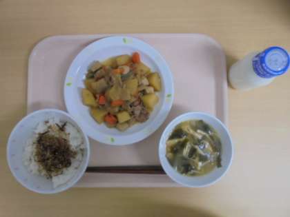 ☆9月11日(月)の給食の写真です。(ごはん 牛乳 かみかみ佃煮 肉じゃが 野菜のみそ汁)