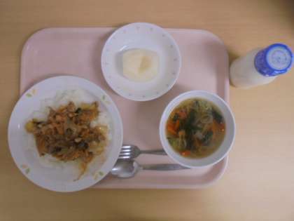 ☆9月13日(水)の給食の写真です。(豚キムチ丼 牛乳 春雨スープ 梨)