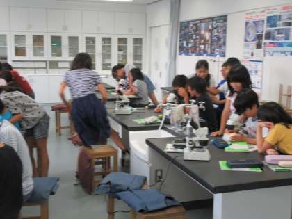 雄花についている花粉を顕微鏡で見ると、不思議な形が見えてきて子どもたちは驚いていました。