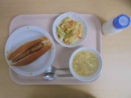 ☆9月15日(金)の給食の写真です。(ホットドッグ 牛乳 卵スープ じゃがいものハニーサラダ)