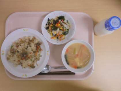☆9月19日(火)の給食の写真です。(かやくごはん 牛乳 呉汁 海藻サラダ)
