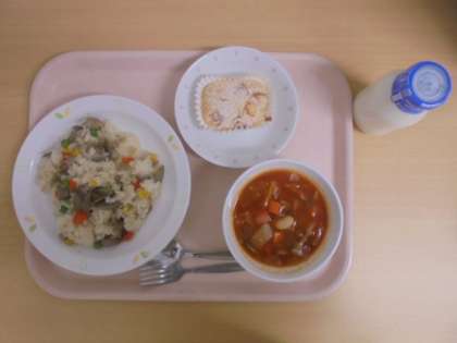 ☆9月22日(金)の給食の写真も掲載させていただきます。(鶏ごぼうピラフ 牛乳 ミネストローネ アップルケーキ)