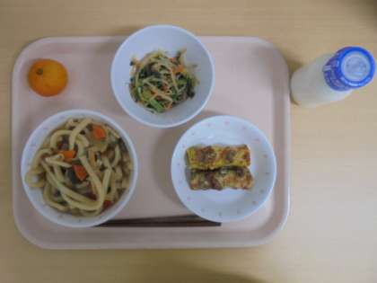 五目うどん 牛乳 ちくわの二色揚げ 野菜のごまだれかけ 冷凍みかん