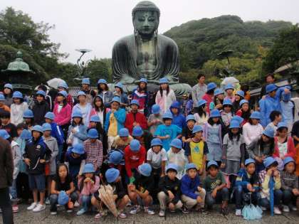 鎌倉時代の歴史ある場所をたくさん訪れてきました。頼朝の墓は天下を統一したにも関わらず、日光の家康の墓と比べて小さいことがよく分かったと思います。9mの黄金の長谷観音に圧倒され、高徳院の大仏を見た子ども達は「大きい〜!!」と声を上げていました。