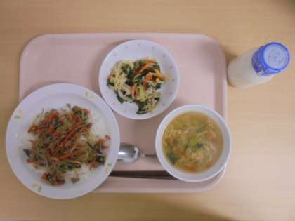 ☆10月5日(木)の給食の写真です。(ビビンパ 牛乳 たまごスープ わかめサラダ)