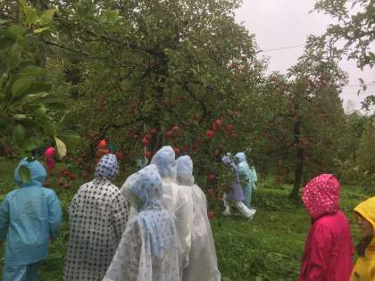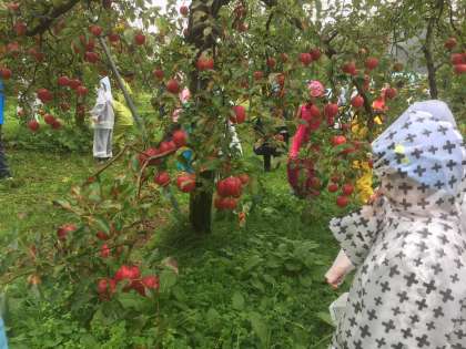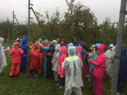 関リンゴ園にて、リンゴをもぎりました。一人一個ずつです。真っ赤になったリンゴを自分で選んでもぎりました。